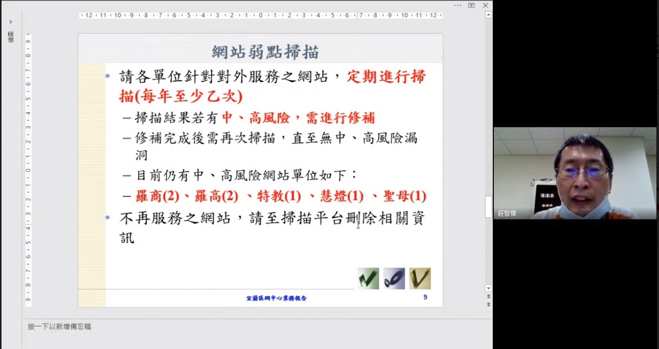 1.本年度為加強對連線單位的服務,區網中心針對各校網管人員、資安人員及一般行政人員開設一連串教育訓練課程,並加強資安防範觀念。